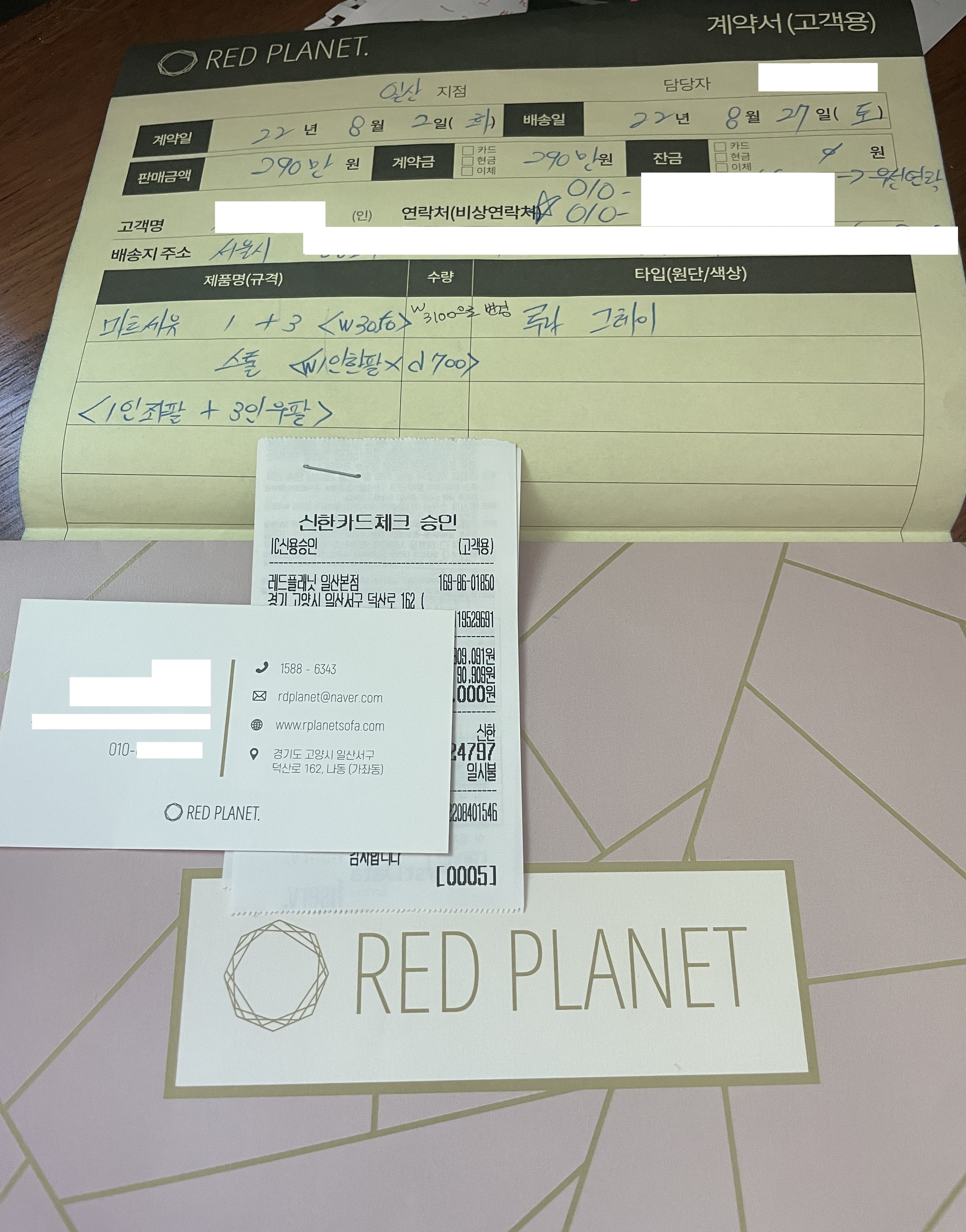 2022.10.11 17시경 저한테 소파 판매하셨던 분께서 연락 와서 이름과 직급을 좀 지워달라고 요청하셔서 명함과 계약서에 있는 이름, 직급, 휴대전화 번호 일부는 지웁니다.