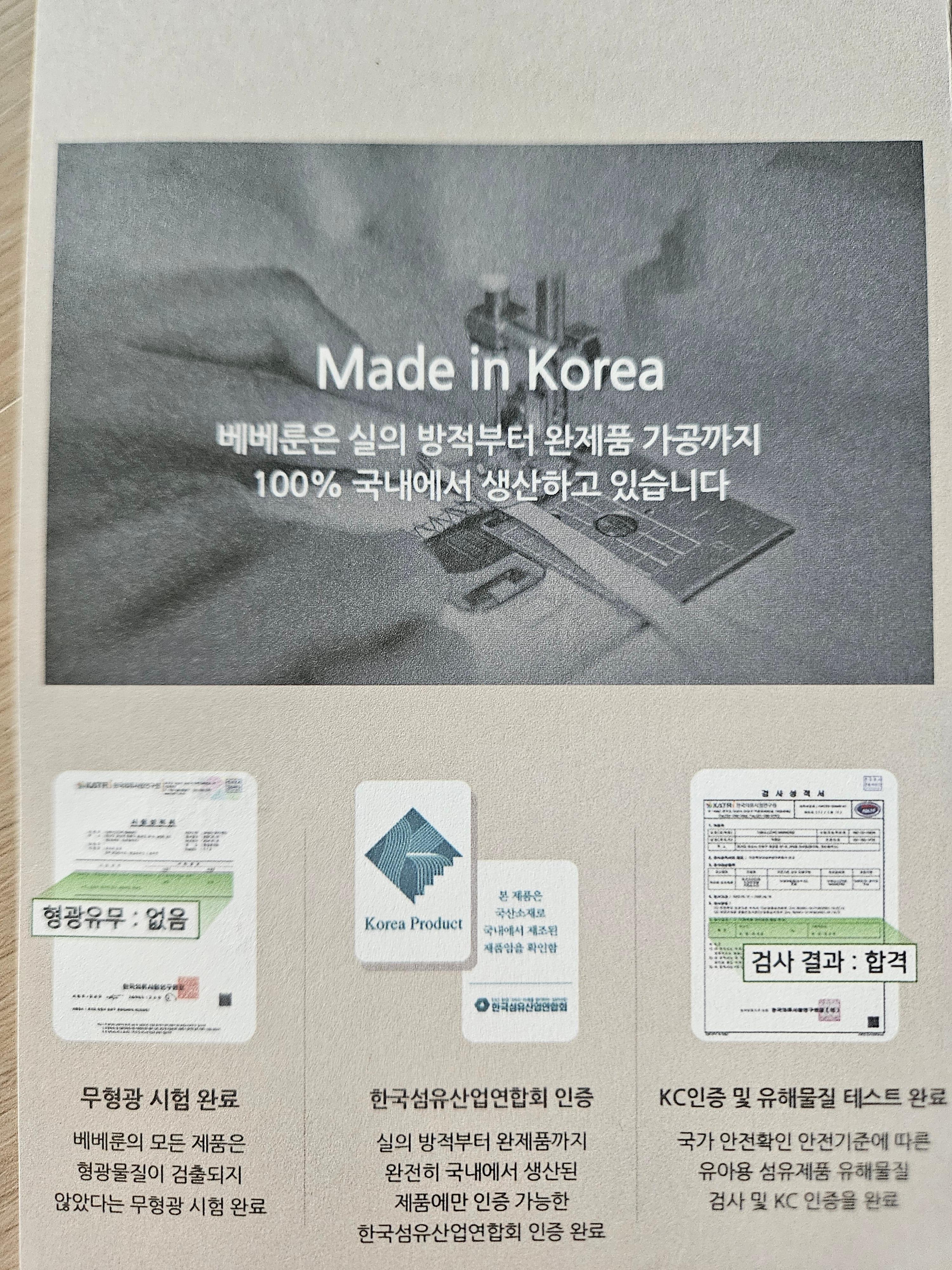 국내생산, 모달 소재, 무형광, KC인증, 유해물질 테스트 완료.